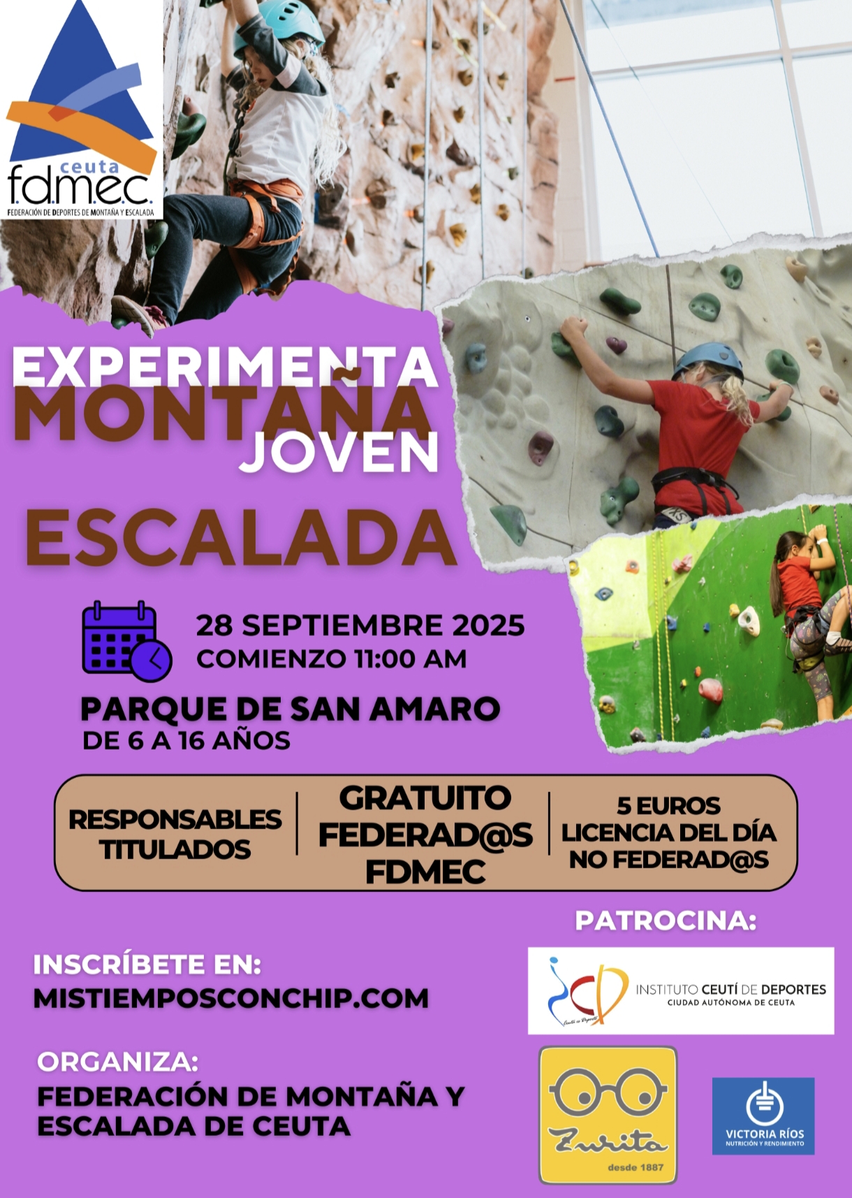 LA ACTIVIDAD ORGANIZADA POR LA FEDERACIÓN DE MONTAÑA Y ESCALADA DE CEUTA, VA DIRIGIDA A TODOS LOS MENORES ENTRE 6 Y 16 AÑOS. TODOS LOS MENORES QUE NO TENGAN EMAIL PROPIO PARA REALIZAR LA INSCRIPCIÓN TENDRÁN QUE REALIZAR LA INSCRIPCIÓN SIN CORREO ELECTRÓNICO.