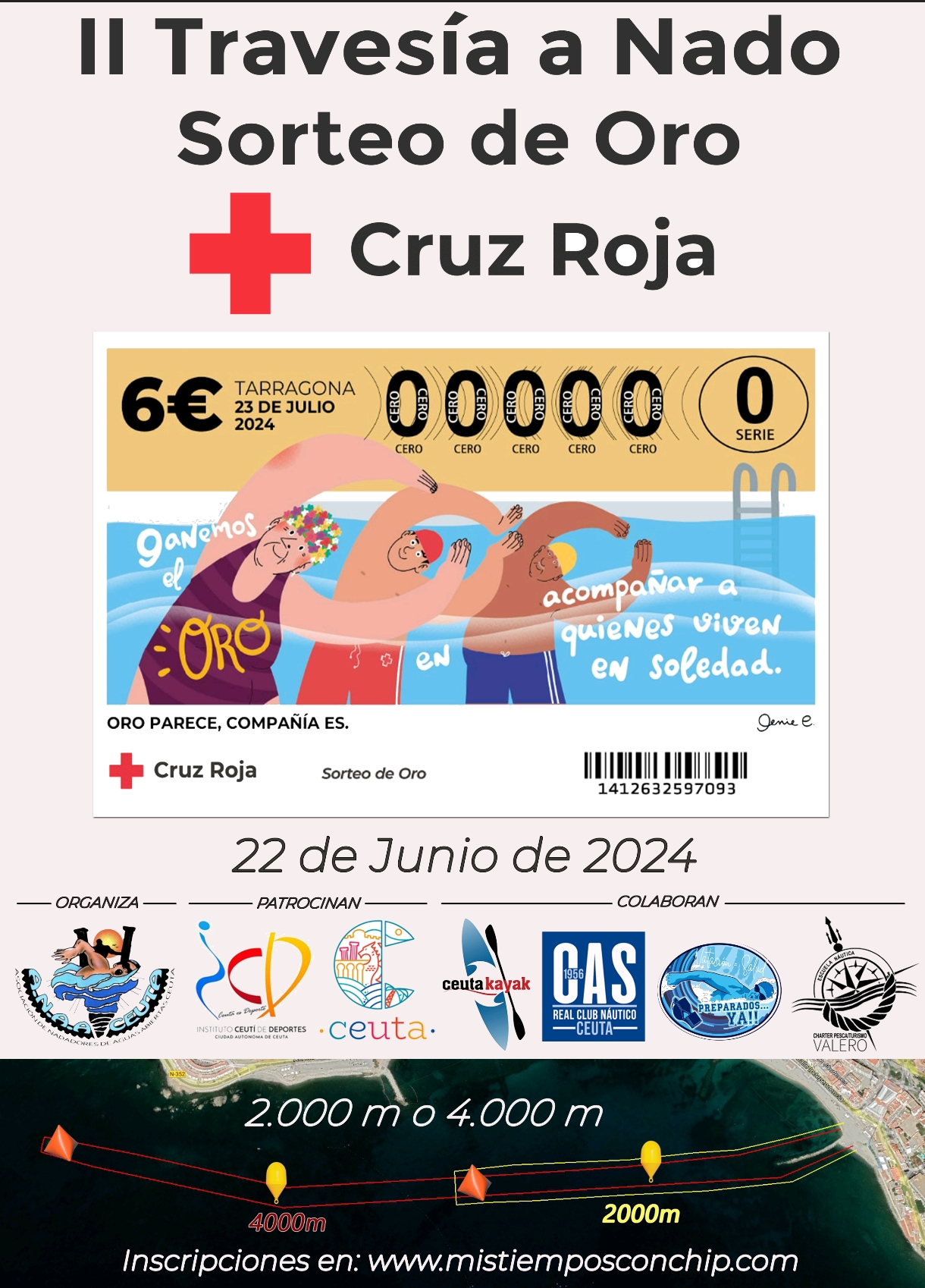 LA TRAVESÍA ESTÁ ORGANIZADA POR LA ASOCIACIÓN DE NATACIÓN DE AGUAS ABIERTAS EN CEUTA A FAVOR DE CRUZ ROJA CEUTA Y POR CADA INSCRIPCIÓN SE REGALARÁ UN BOLETO DEL SORTEO DEL ORO.